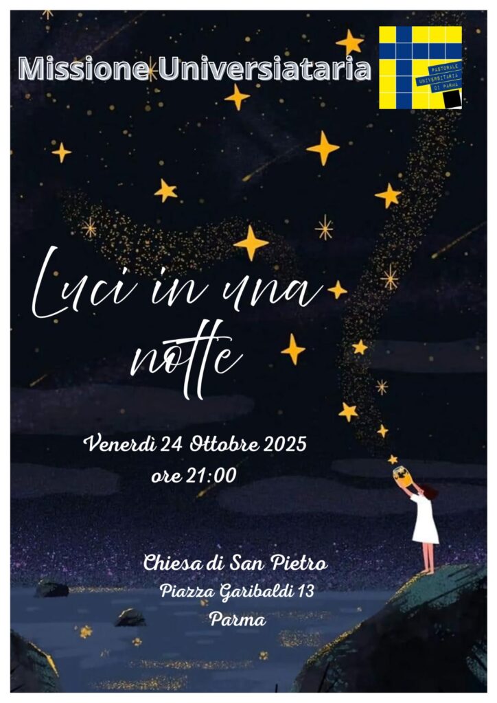 La serata conclusiva della missione, dal titolo “Luci in una notte” si terrà venerdì 24 Ottobre dalle ore 21:00 alle ore 24:00 presso la Chiesa di San Pietro e l’antistante piazza Garibaldi. Tutti possono prendervi parte ed entrare in chiesa anche solo per qualche istante.