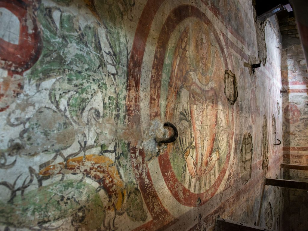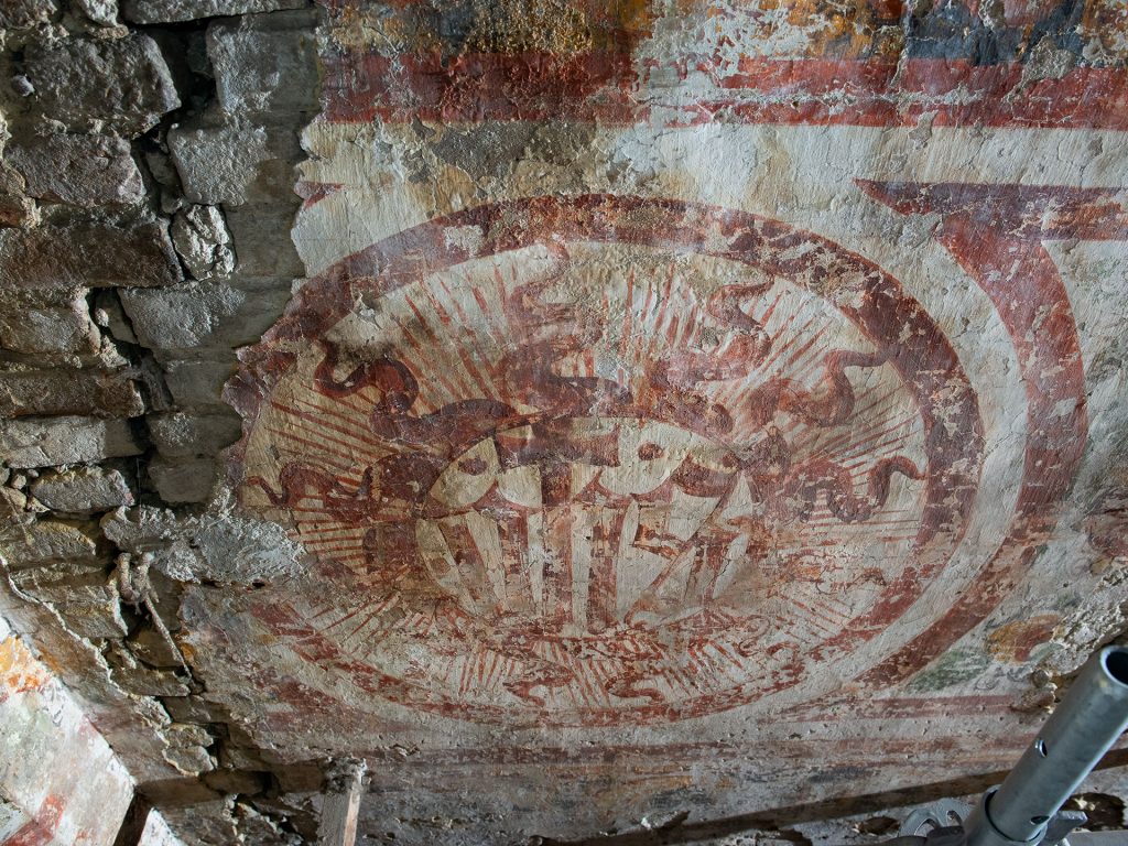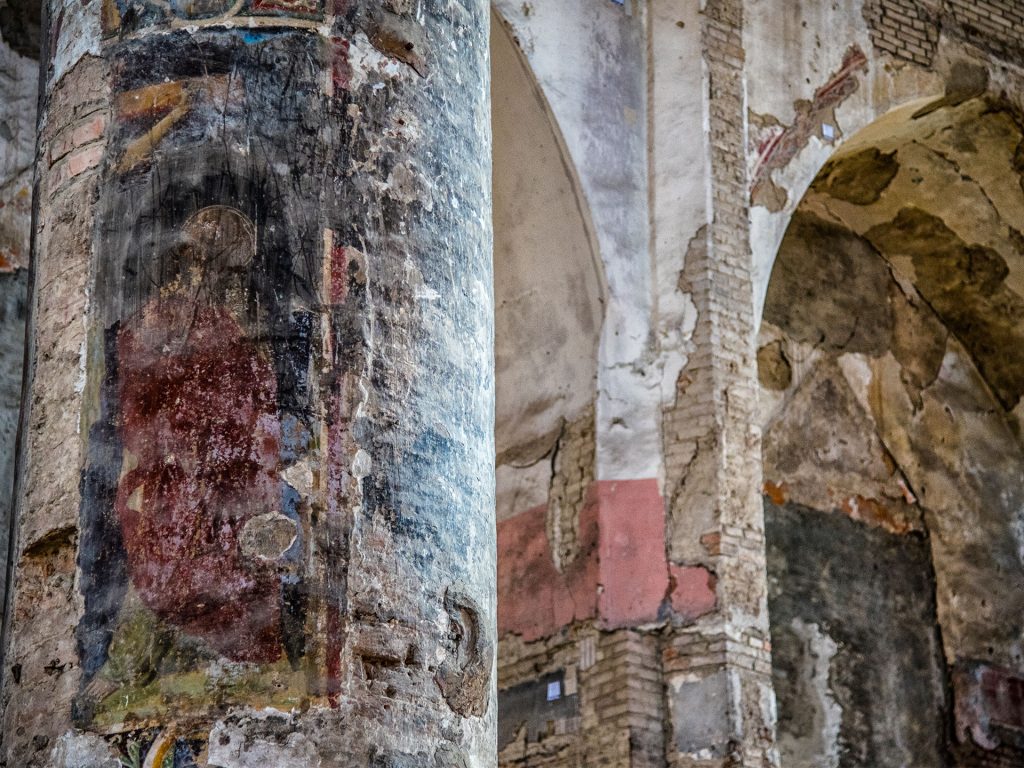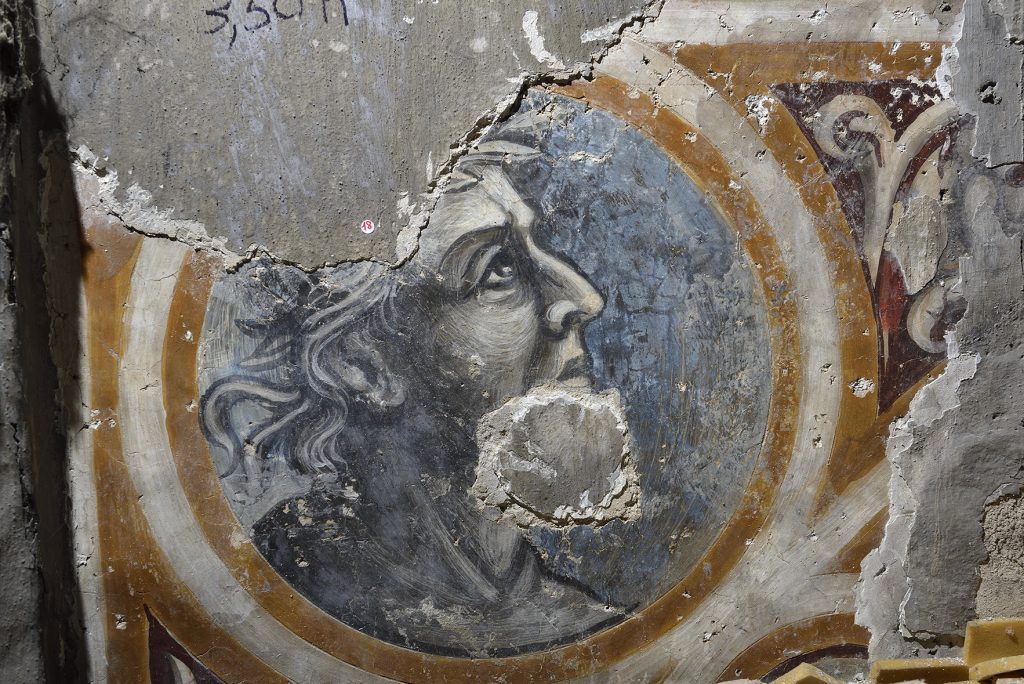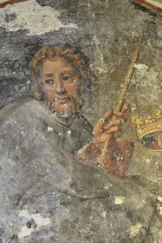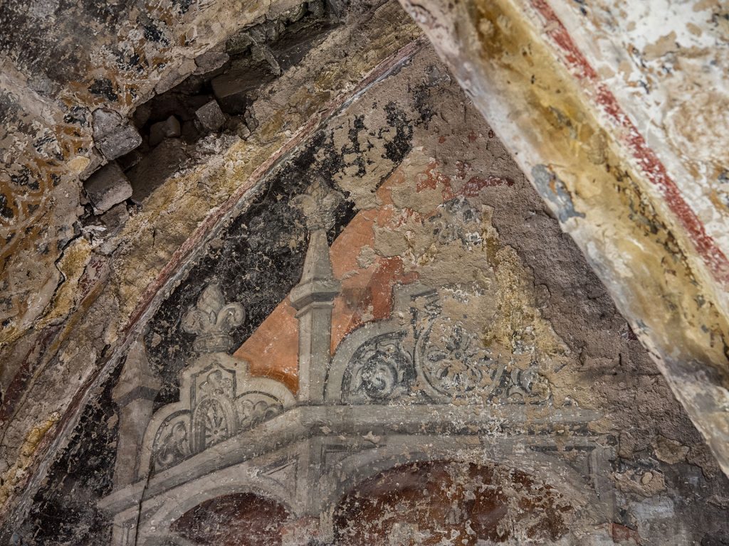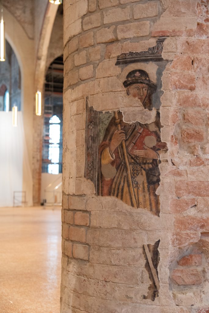 Gli affreschi vennero coperti da intonaco grigiastro durante il periodo in cui la Chiesa venne utilizzata come carcere. Solo pochi furono riportati alla luce dopo il 1974. Venne ritrovata traccia di intonaci appartenenti alle diverse fasi di costruzione della chiesa. Le più recenti opere di restauro hanno consentito di ripulire il Cristo della chiave di volta, gli affreschi dell’abside, e l’affresco di San Giacomo (entrando dal portone principale, sulla seconda colonna a sinistra).